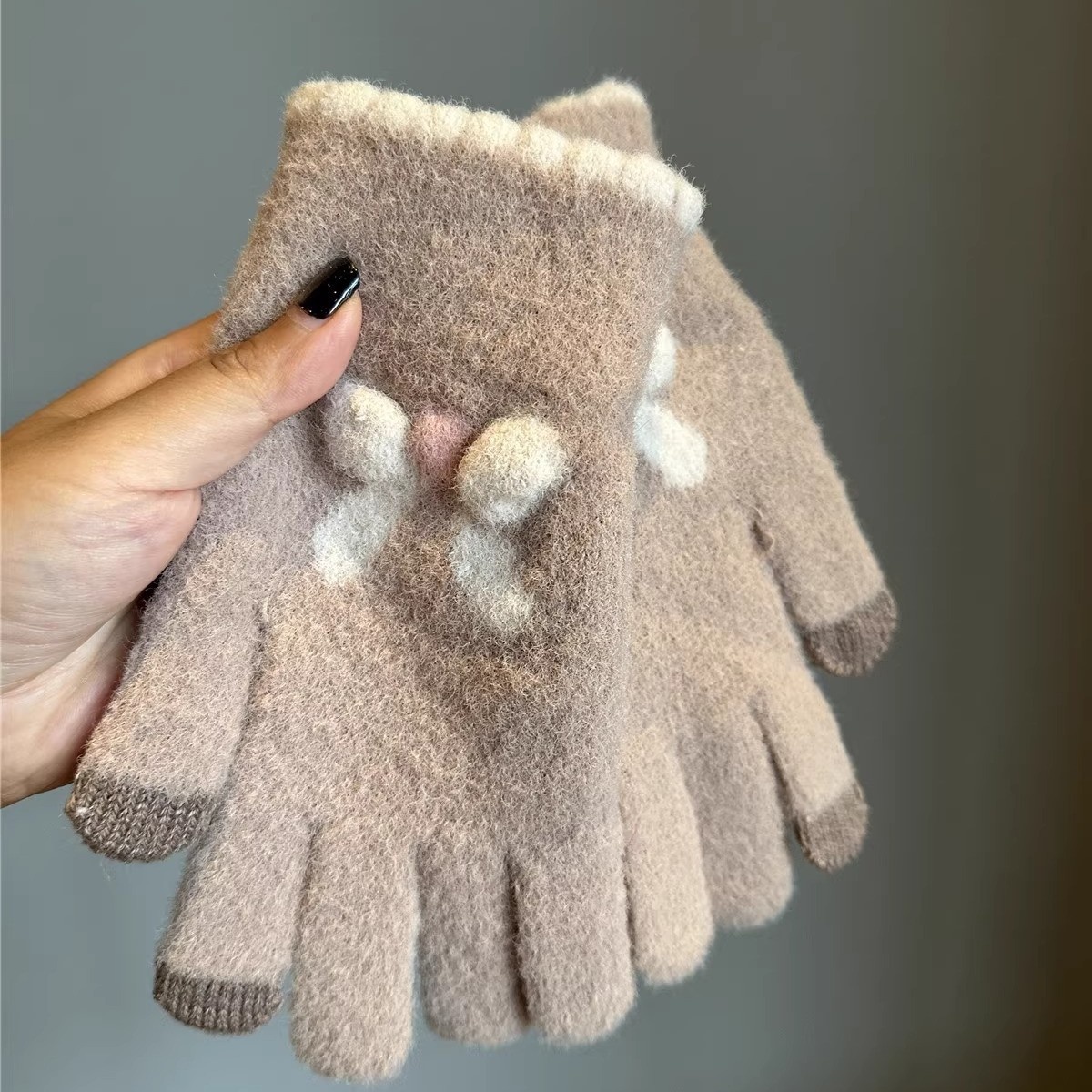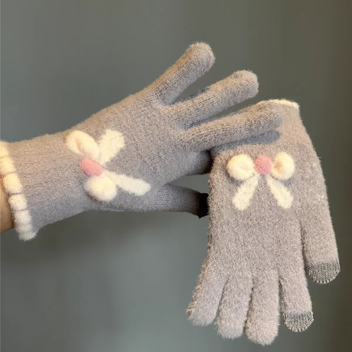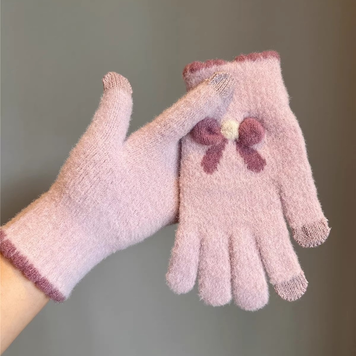 001 Frostschutz-Handschuhe für Damen, Winter, Fleece-gefüttert, warm, Touchscreen-fähig, fingerlos, Fahrradhandschuhe, gestrickt, Schleife, Plüsch, Seeblau
