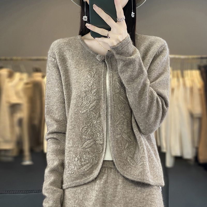 100 % Strickjacke für Damen, Rundhalsausschnitt, schwerer, lockerer, süßer, lässiger Wollpullover, Strickoberteil