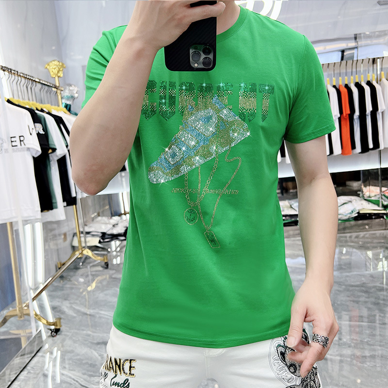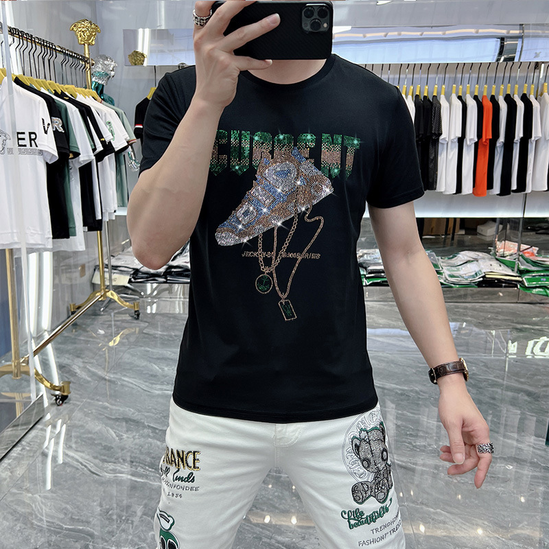 2023 New Summer Ice Silk Short Sleeve T-shirt Men's Trend Slim Fit Half Sleeve Fashion Brand T-shirt Shoes Hot Diamond Silk Cotton