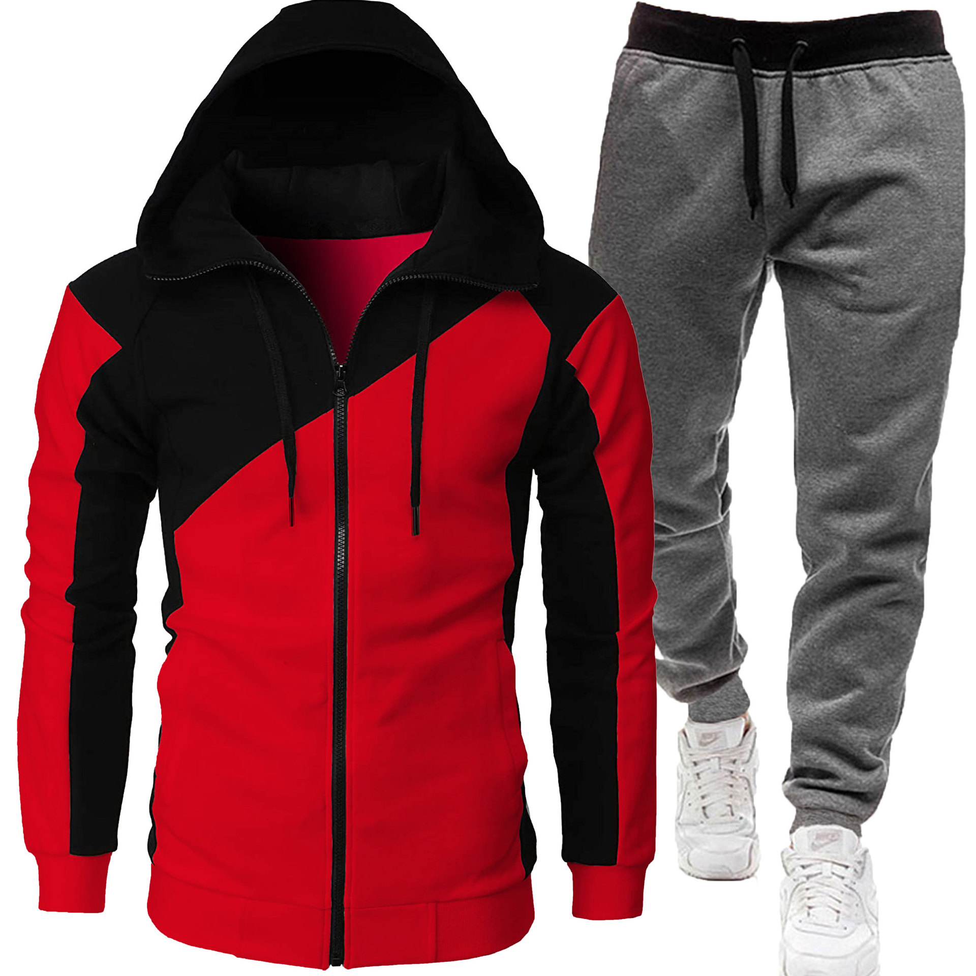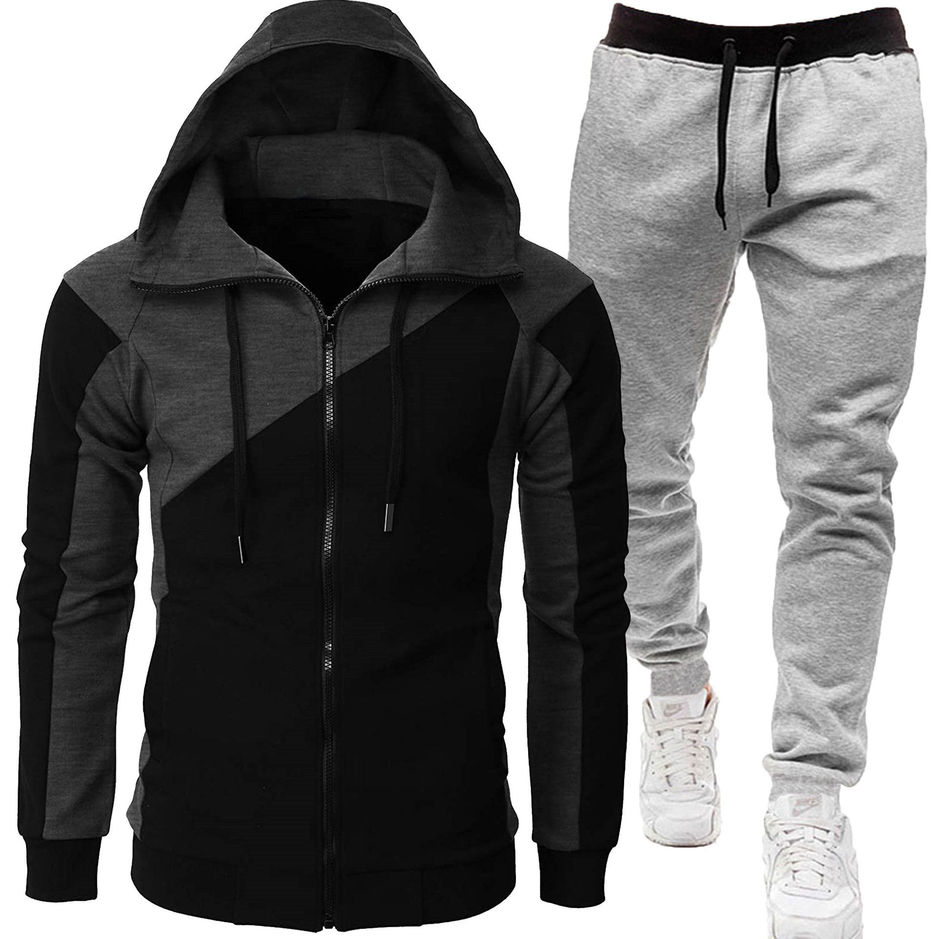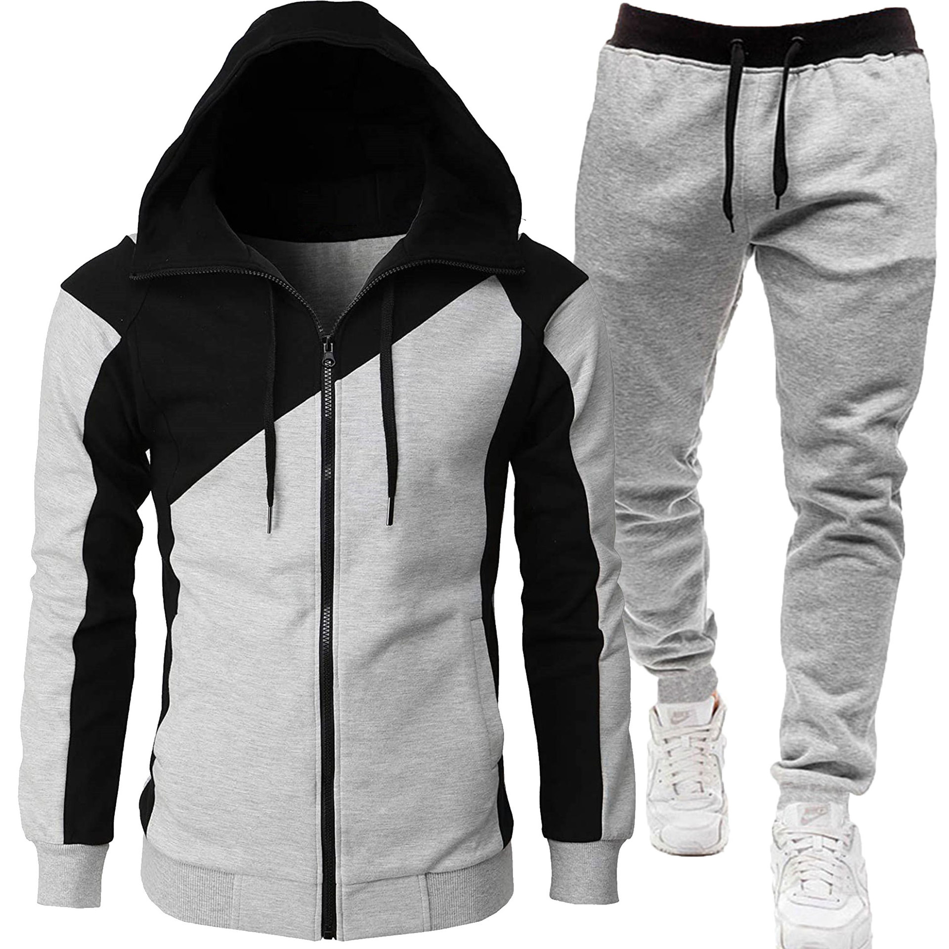 2024 autumn and winter sports dual color patchwork jacket, long sleeved pants, hooded casual sports men's set