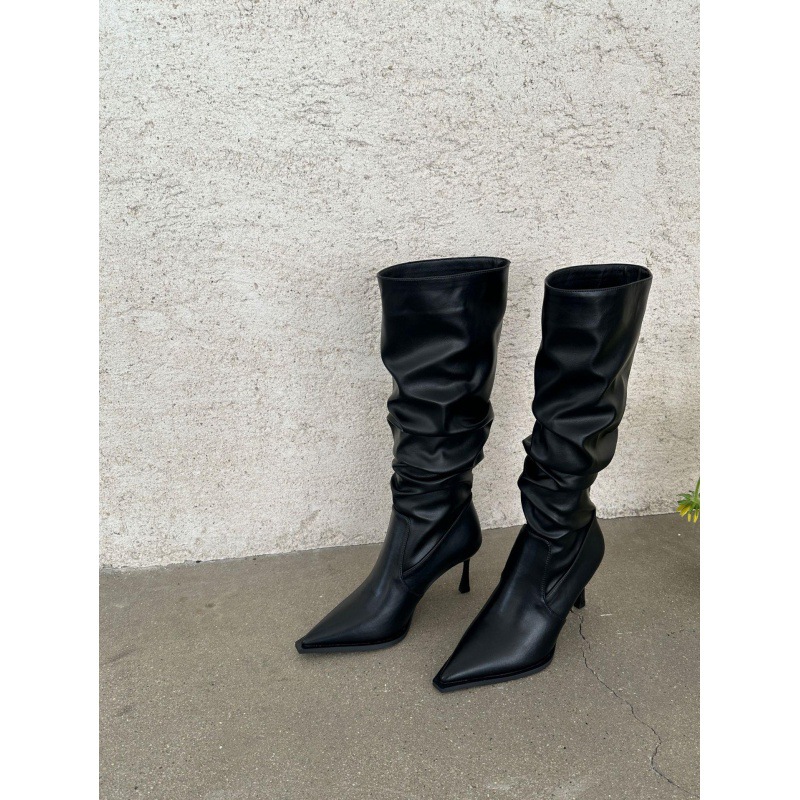 2023 autumn and winter new pointed pleated leather boots with high heels and sleeves, designed to look slimmer for women