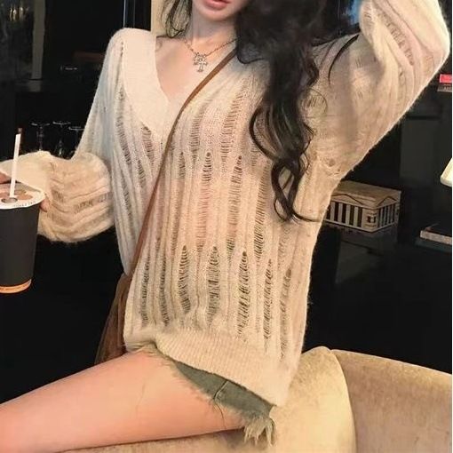 2024 Spring/Summer New Solid Color V-neck Knitted Sweater with High Quality, Long Sleeve Hollow Head, Loose and Skinny Look, Women's Sweater