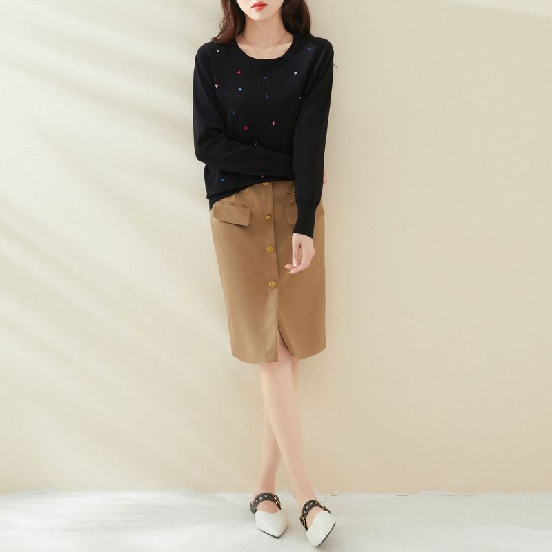 2024 Autumn New Embroidered Loose Simple Versatile Round Neck Pullover Long Sleeve Knitted Sweater Women's Top