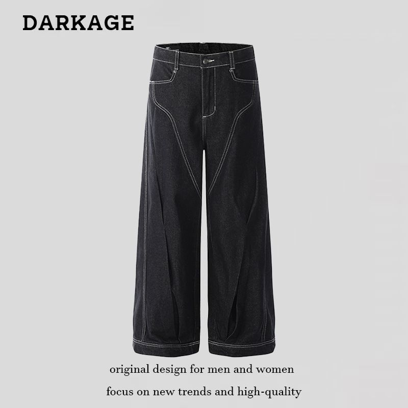 2025 Lässig strukturierter, linearer, plissierter, abgesteppter Schnitt im amerikanischen Stil, Originalfarbe, A-Linie, Scimitar-Jeans, Unisex