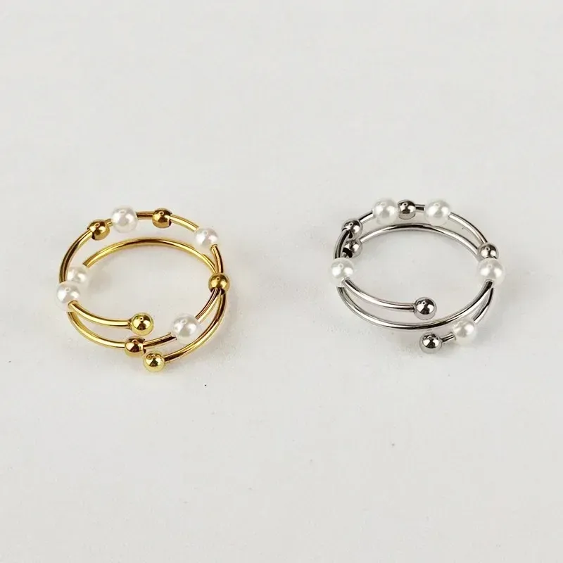 Stainless Steel Rotate Beads Anxiety Ring Adjustable Stress Relief Pearl Beaded Fidget Rings For Women Men Fashion Jewelry Gifts