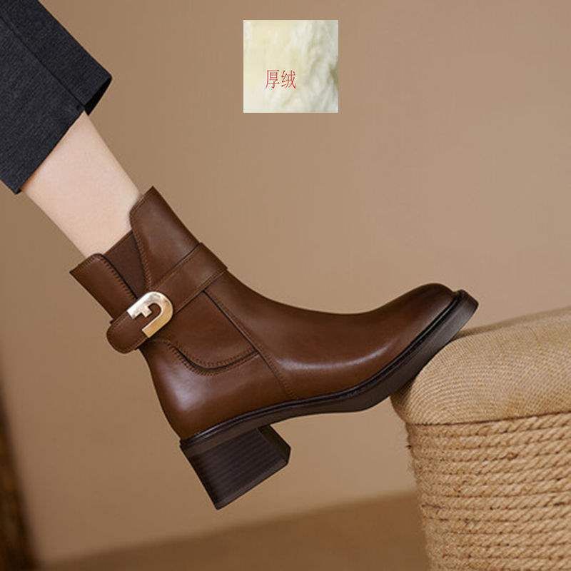 2025 Winter New Fleece-Lined Martin Boots British Style Chunky Heel Short Boots Women's Square Toe Thick Sole High Heel Boots