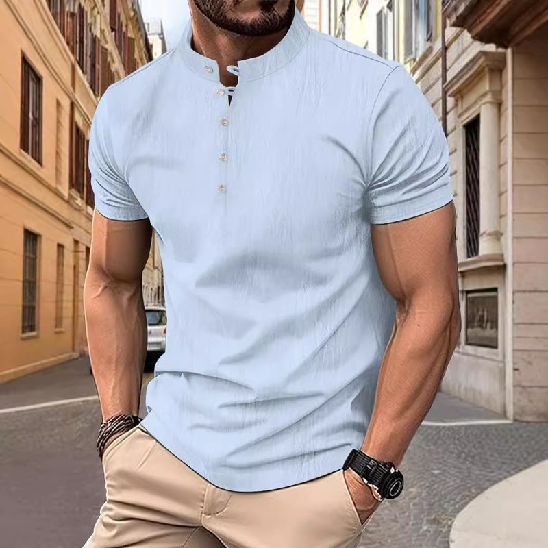 2025d 2024 Neue Baumwolle Leinen Einfarbig Casual Kurzarm Stehkragen Henley Shirt Herrenmode