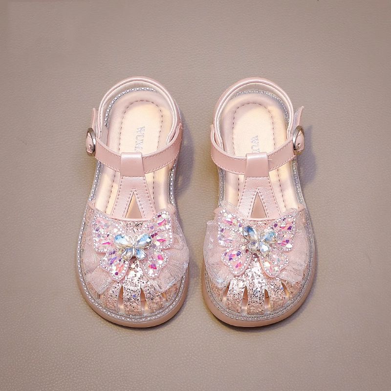 Girls Sandals Children's Princess Shoes 2025 New Summer Little Girls Soft Bottom Crystal Bow Closed-Toe Eight-Claw Shoes