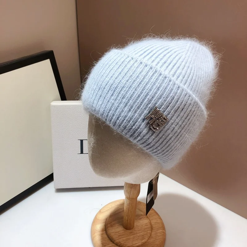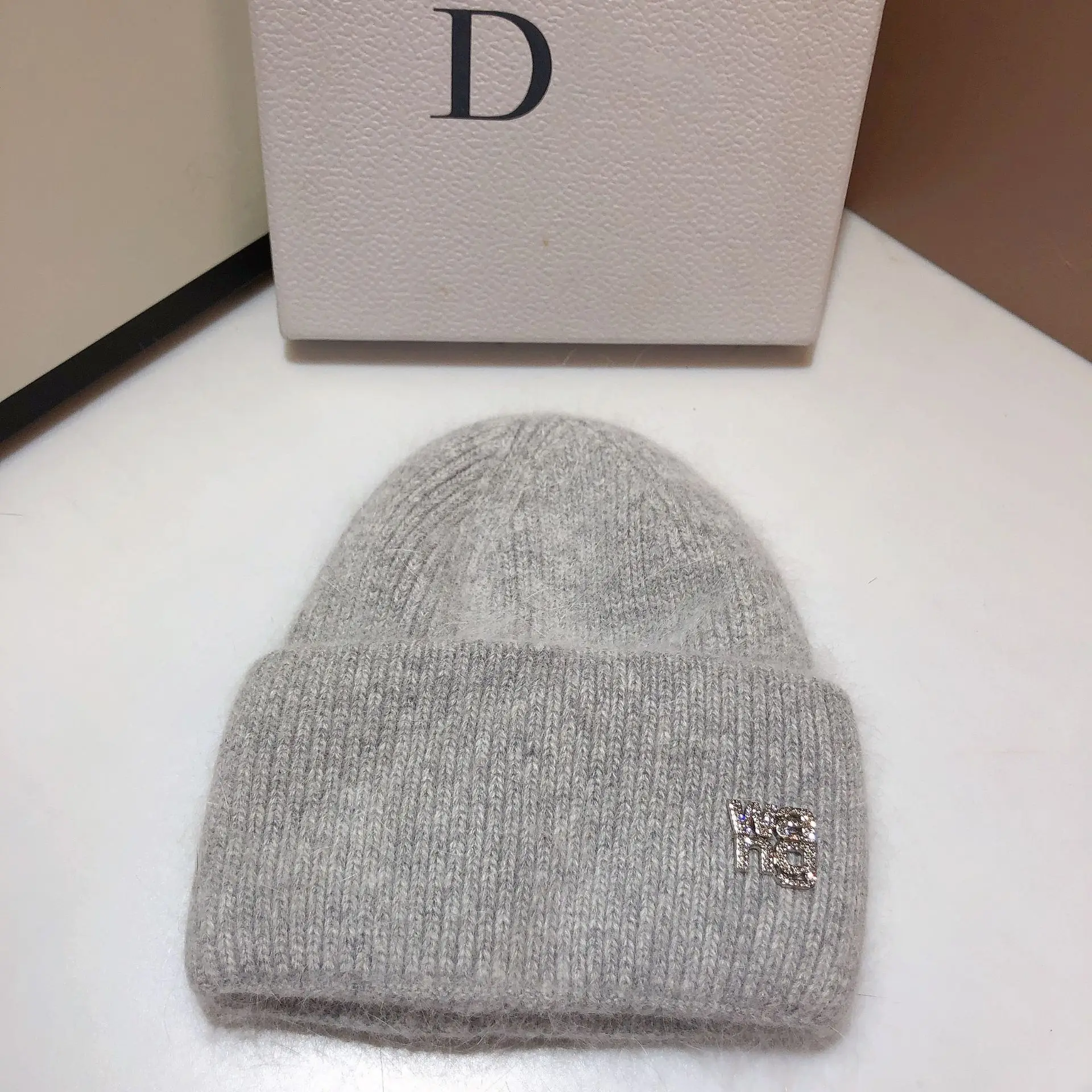 Fashion Women Winter Hat Real Rabbit Fur Knitted Beanie Caps Diamond M Letter Lady Casual Hats Warm Wool Skullies Beanies