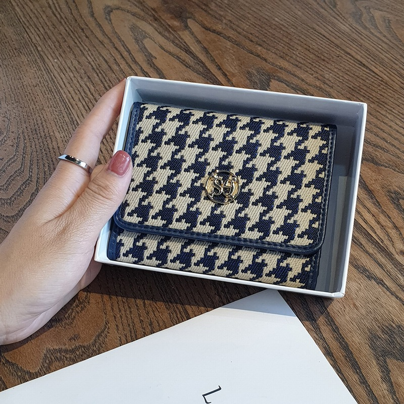 3-fach Damen-Geldbörsen, kurze Brieftasche aus echtem Leder, Markendesign, Hahnentritt-Stickerei, zweifarbiger Kartenhalter aus Rindsleder