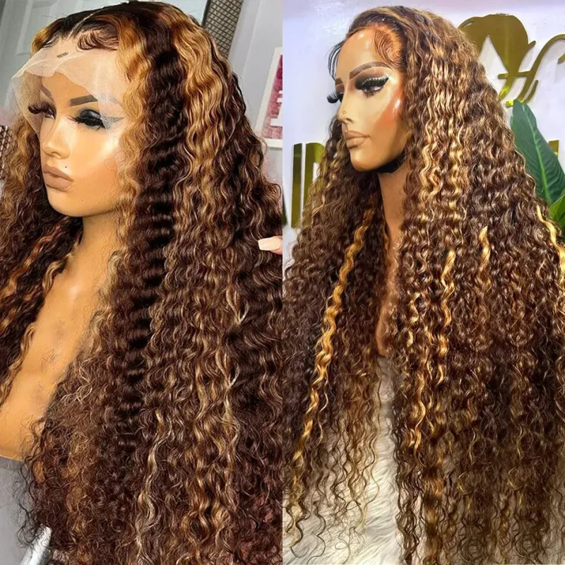 32 Zoll Highlight Curly Lace Front Echthaar Ombre Farbige Wasserwelle Perücke Brasilianisches Remy 180%