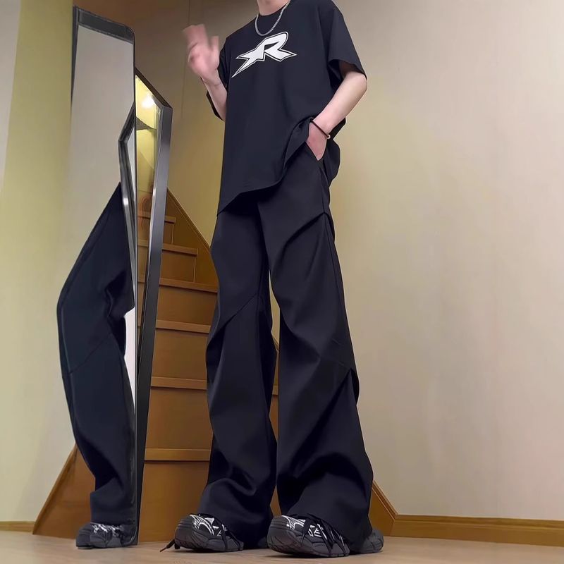 Amerikanische High-Street-Hose, plissiert, drapiert, einfarbig, Unisex, lässig, leicht ausgestellt, hochwertiges Design, Cleanfit-Hose