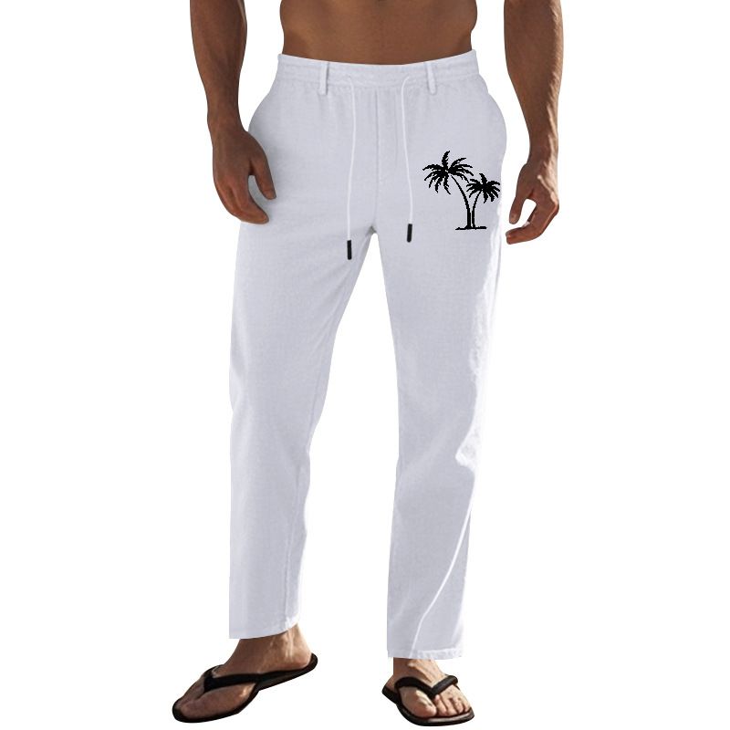 Atmungsaktive, lockere Sporthose aus Baumwolle und Leinen für Herren im amerikanischen Stil mit Kokosnussbaum-Print