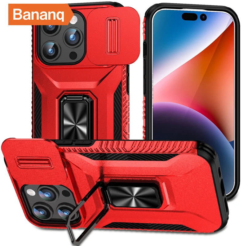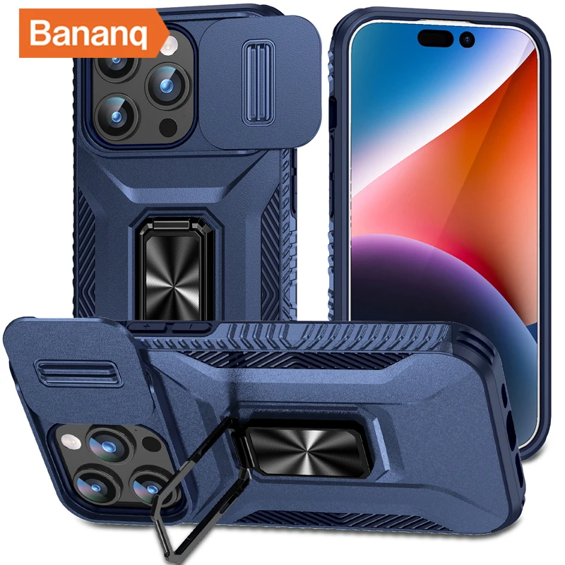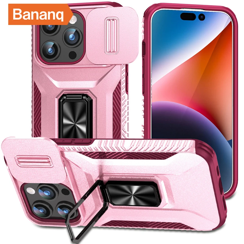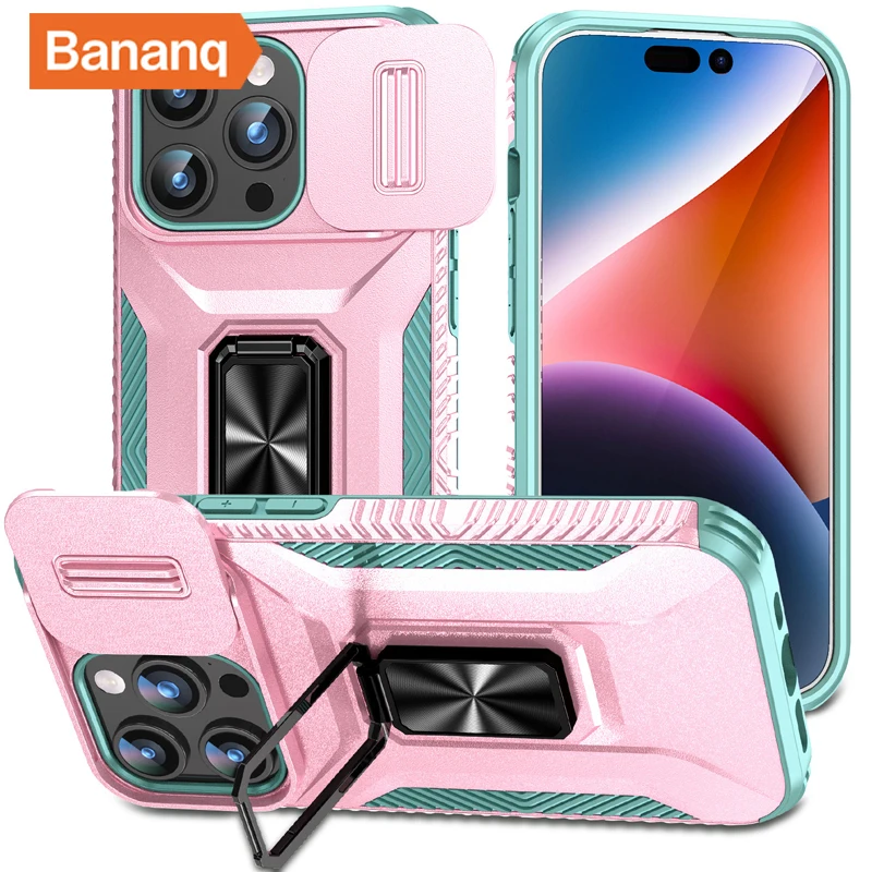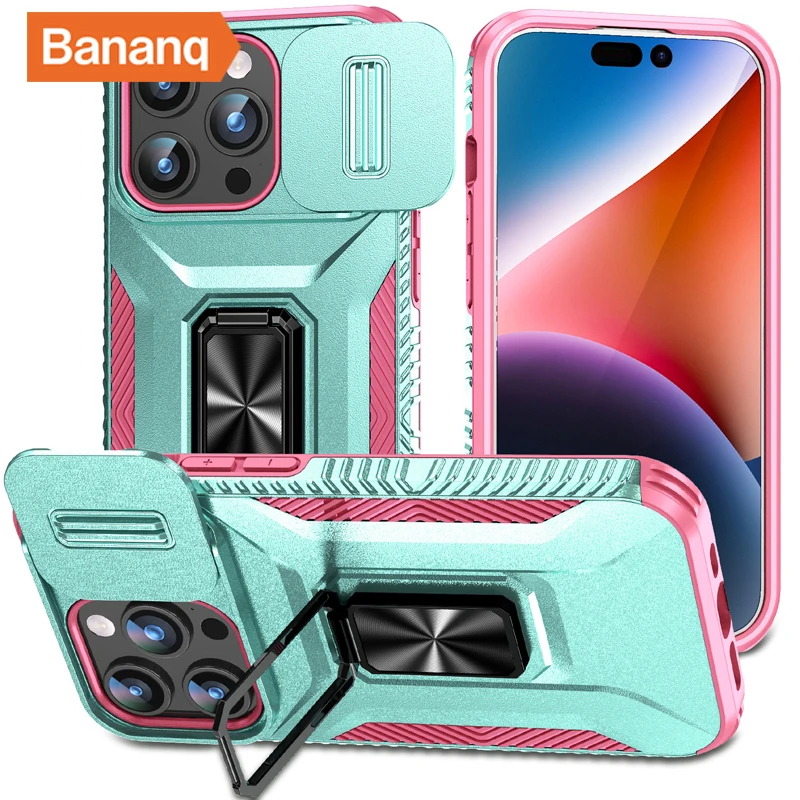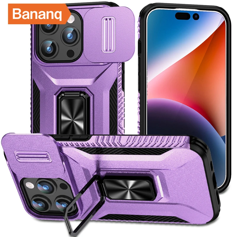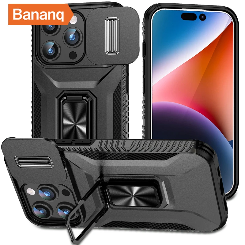 Bananq Slide Push Window Camera Lens Back Case For iPhone 15 14 Plus 13 12 Mini 11 Pro Max Shockproof Magnetic Ring Stand Phone Cover
