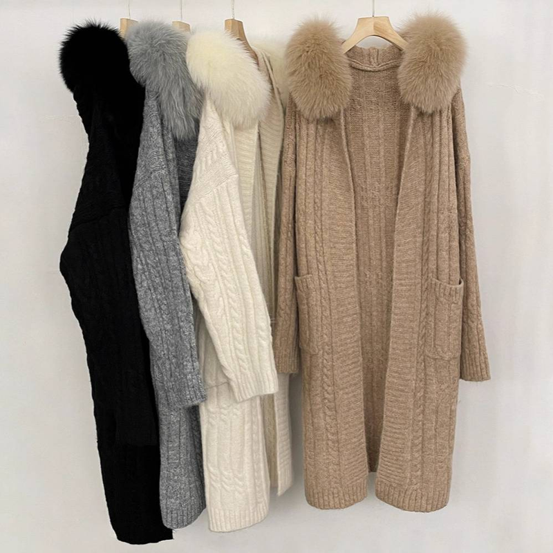 This floor-grazing cardigan is a masterpiece of texture – hand-knit nylon forms a cloud-like drape, while the real fox fur trim adds instant glamour. The hooded design and open front make it effortlessly chic for any laid-back occasion.