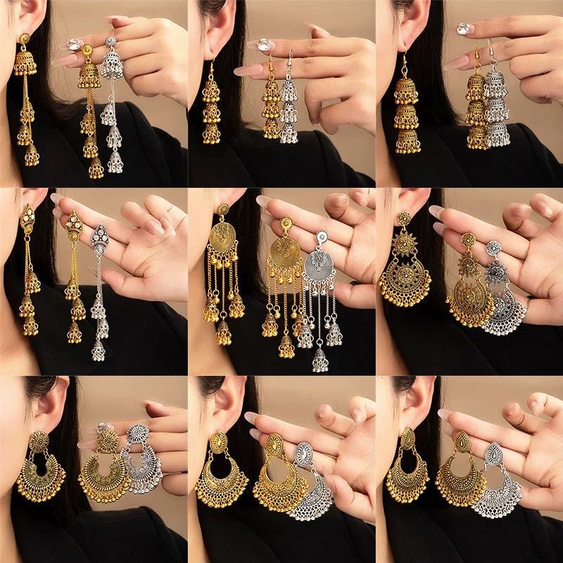 Boho-Quastenohrringe im Ethno-Stil mit hochwertigen geschnitzten Blumen und halbrunden Glockenanhängern