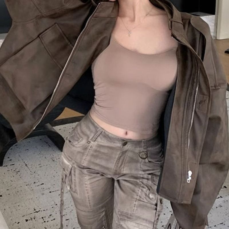 Braune Motorradlederjacke für Damen, Herbst 2025, neue vielseitige kurze Jacke mit lockerem Tragegefühl