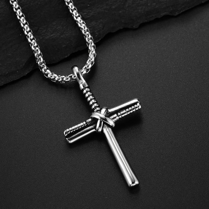 Men`s Cross Necklace Stainless Steel Baseball Bat Shaped Pendant Box Chain Christians Male Necklace Religious Jewelry Gift