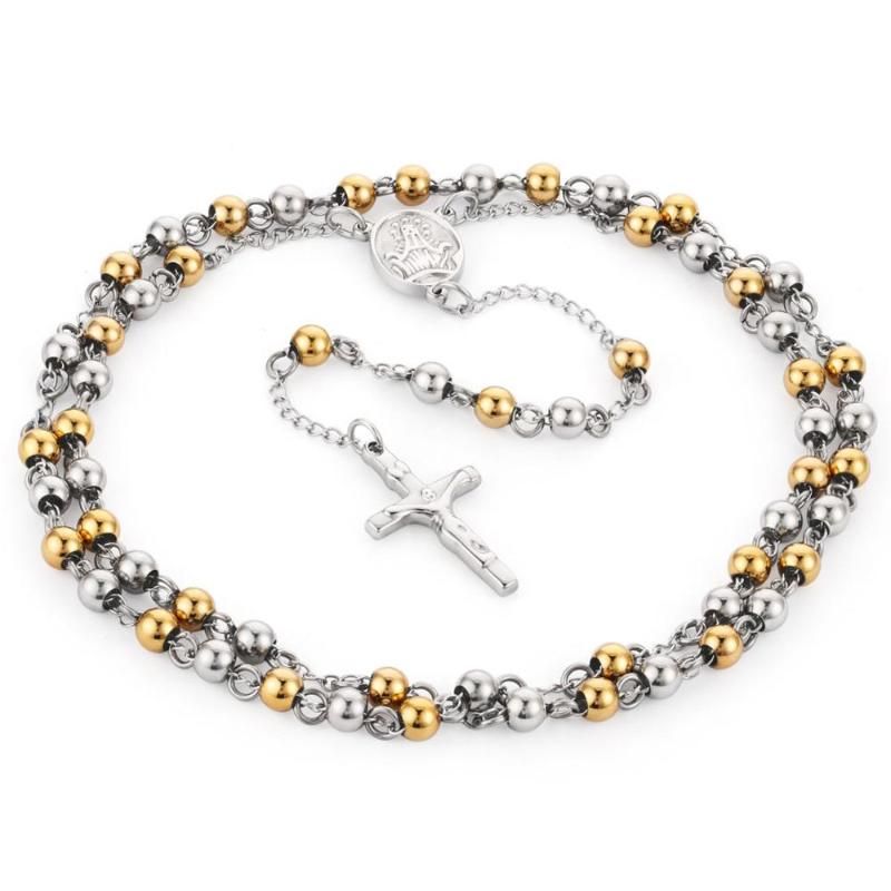 Ketten Edelstahl Perlen Halskette Gold Farbe Rosenkranz Halsketten Anhänger Jesus Christus Kreuz Lange Kette Männer Frauen