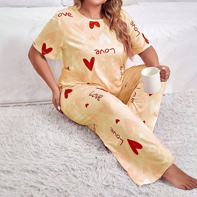 ChicShe Pyjama-Set in Übergröße für Damen: Lange Hose, Kurzarm-T-Shirt mit Herzmuster, 2-teilig, bordeauxrot