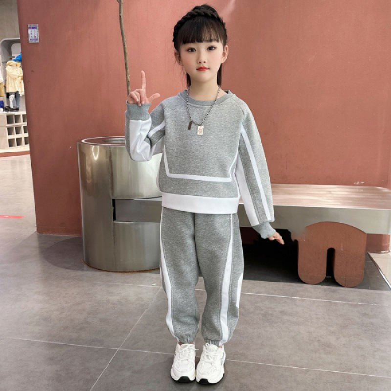 Children's clothing girls' autumn outfit set 2024 new mid size children's long sleeved contrasting hoodie, Haren pants sportswear two-piece set