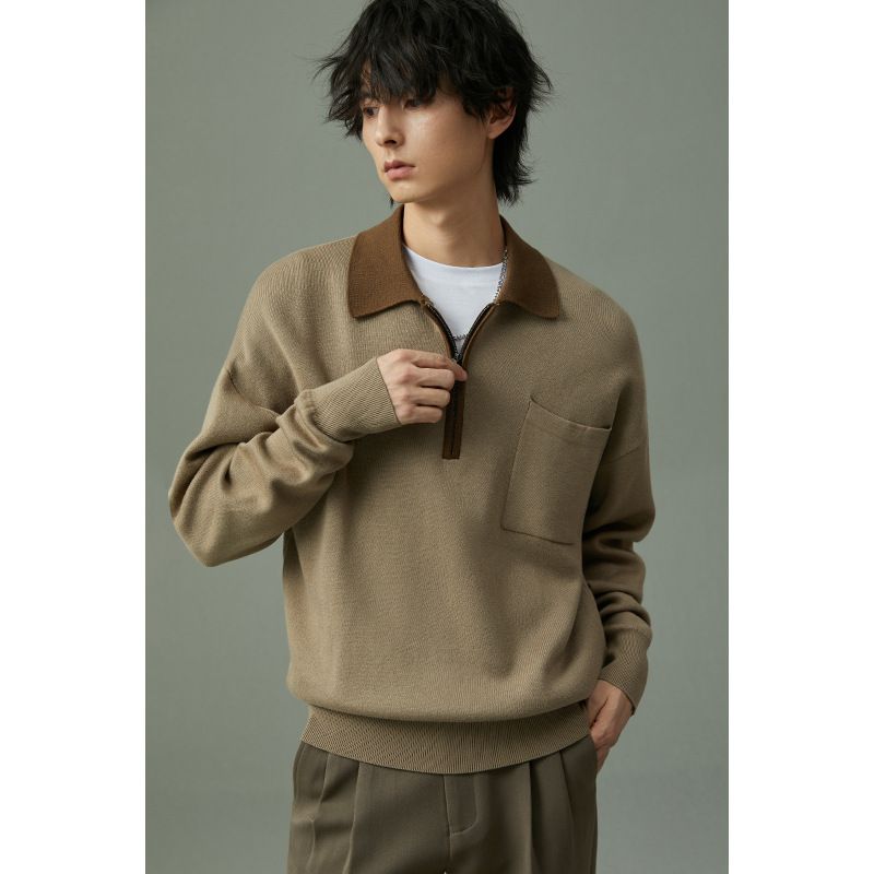 Color Blocking Gestricktes Poloshirt Halboffener Kragen Pullover Langarm Top Herren Herbst Leicht Reifer Stil High-End