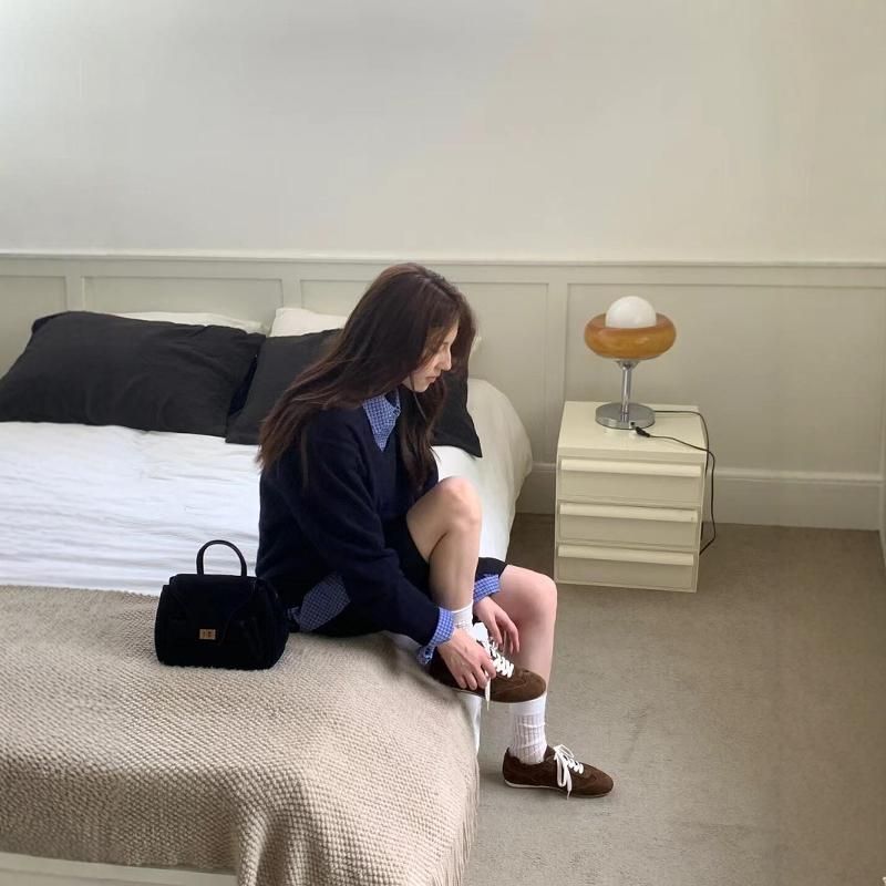 2024 Korean version comfortable genuine leather handmade flat bottom lace up German training shoes versatile elastic band sports and leisure shoes for women