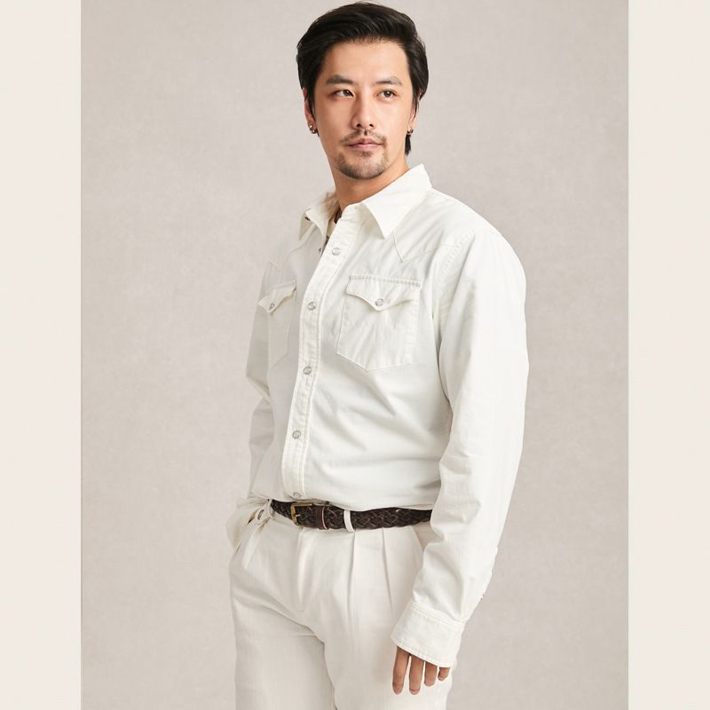 CT Double R Büro Langarm Elfenbein Weiß Gewaschen Denim Hemd Männer Taste Dekoration Reine Baumwolle
