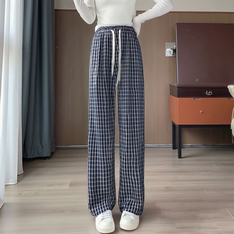 Women's Plaid Pants Autumn Winter New Loose Draped Sleep Pants Petite High Waist Slimming Straight Wide Leg Pants