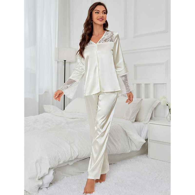 Damen Pyjamas Herbst und Winter Spitze Mesh Ärmel Lange Hosen Zweiteiler Set Seide Home Kleidung Nacht