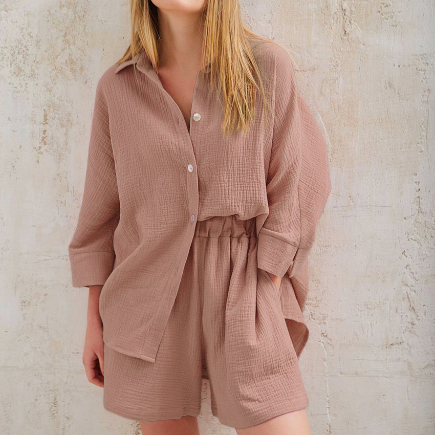 Damen Nachtwäsche Langarm Shorts Anzug Dünner lässiger Crêpe-Hauskleidungspyjama Oberbekleidung aus reiner Baumwolle