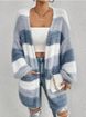 Damen-Strickcardigan mit langen Ärmeln, Streifenmuster, kuscheligem Fleecefutter, V-Ausschnitt und Laternenärmeln, Oversized-Passform – Hellblau, Herbst-Winter-Mode