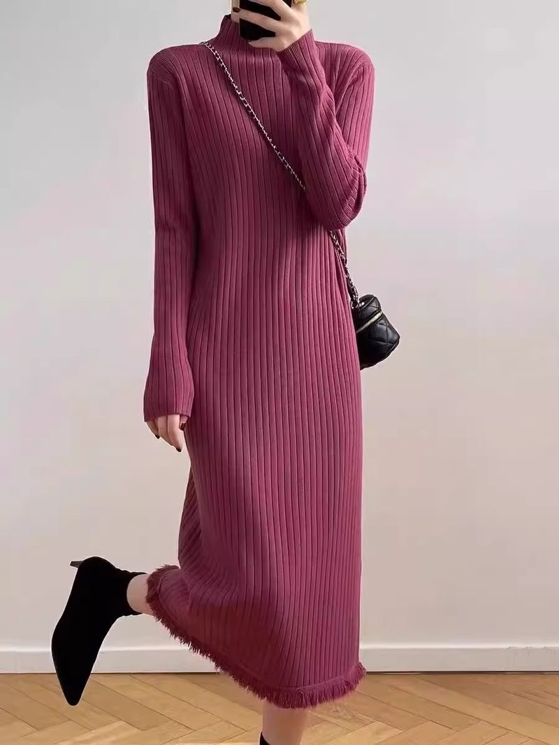 Fringed Autumn Winter Women's Sweater Dress Long Sleeve Over-the-Knee Knitted Mid-Length Loose Wool Base Layer