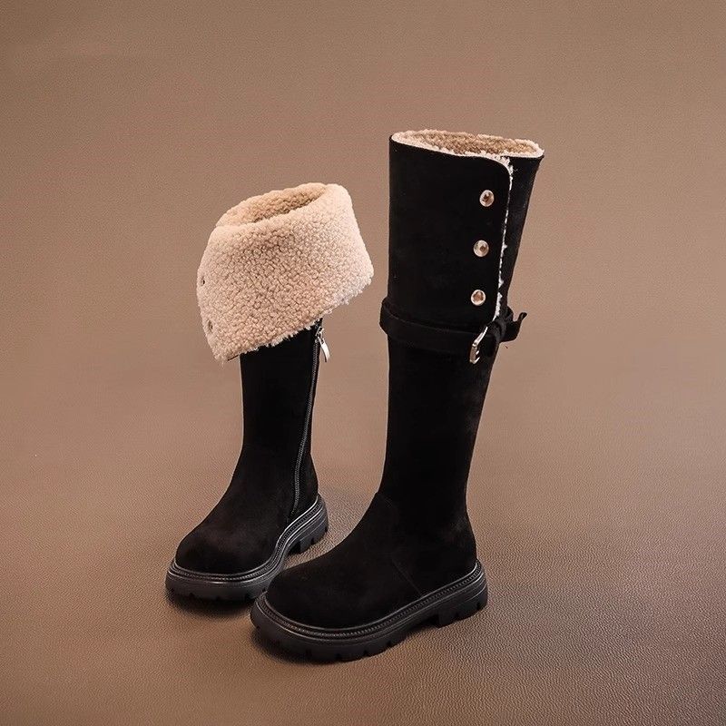 Dunkelweiße Stiefel für Mädchen, neue modische lange, mit Fleece gefütterte, verdickte, warme Lederstiefel für den Winter