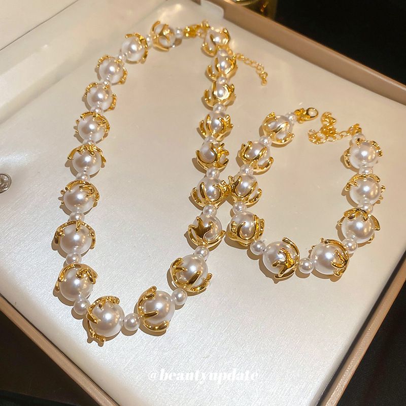 Echtes Gold Galvanisiertes Blumenperlenarmband-Halskettenset im Palaststil mit High-End-Temperament, Schlüsselbeinkette,