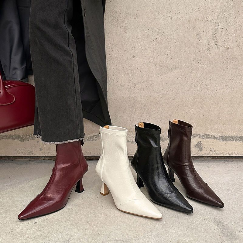 Genuine Leather French Style Pointed Toe Stiletto Heel Stretch Slim Boots Commuter Versatile Fashionable White Short Boots for Women