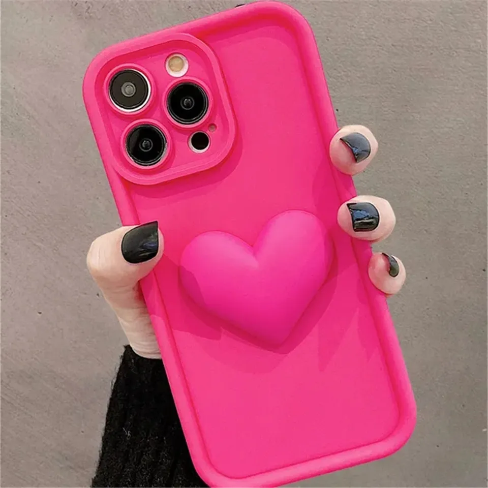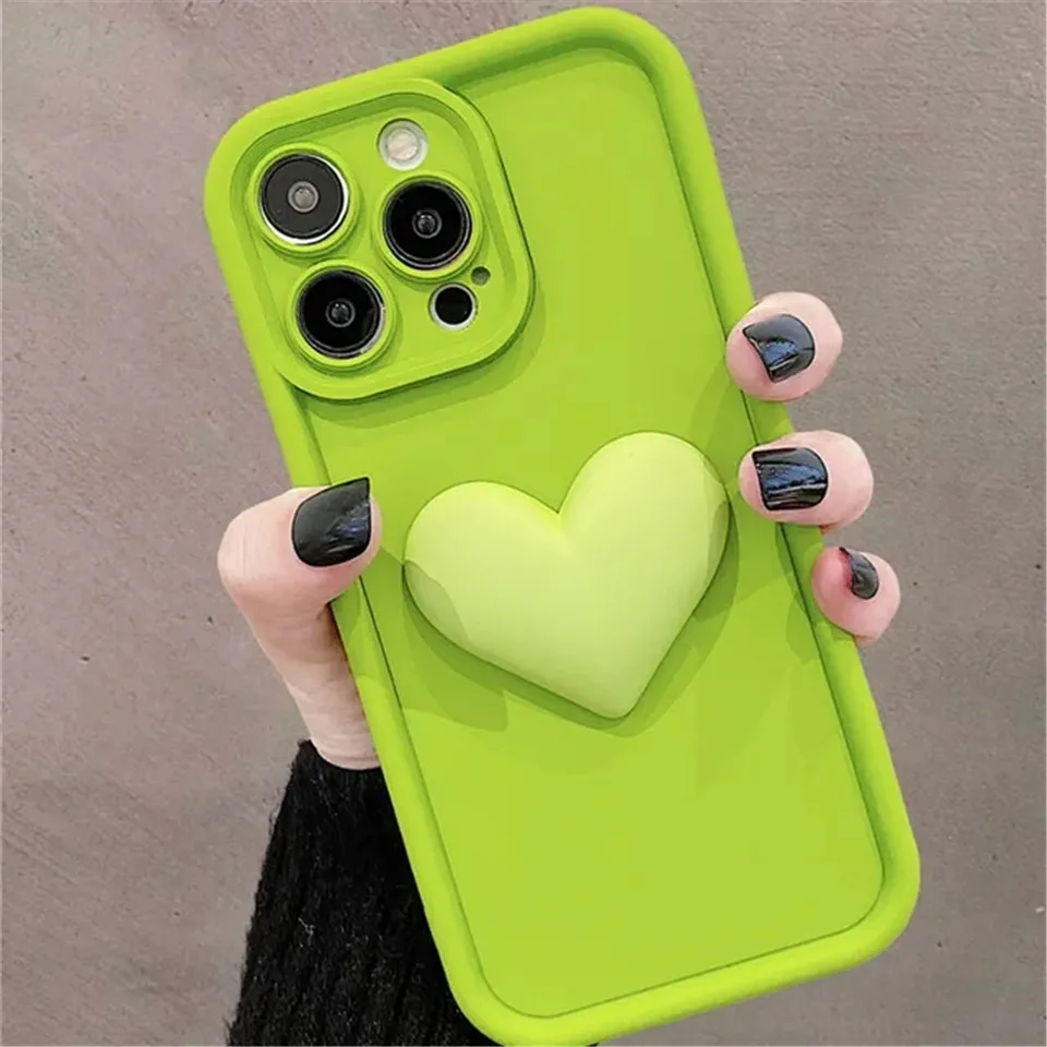 Solid Color Simple Cute 3D Love Heart Case For iPhone 11 12 13 14 15 Pro Max 15Plus Camera Protection Soft Silicone Back Cover