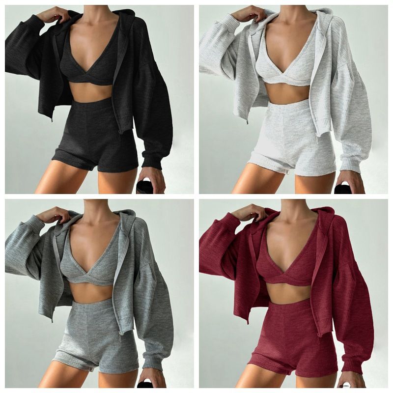 Einfarbiges, sportliches, lässiges Sweatshirt-Set für Damen, Weste mit V-Ausschnitt, Shorts + Kapuzenjacke