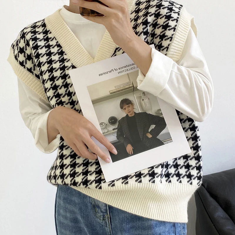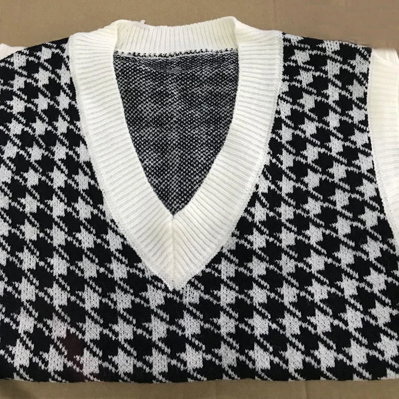 Eleganter Hahnentrittmuster-Pullover mit lockerem Strick, Herbst, V-Ausschnitt, ärmellos, dick, lässig, für Damen, schicke Tops