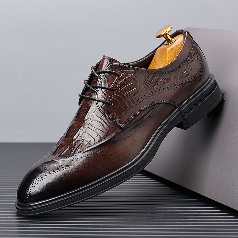 Men's Brogue Leather Shoes Business Formal Pointed Crocodile Pattern Spring Soft Sole Top Layer Cowhide Men's Shoes