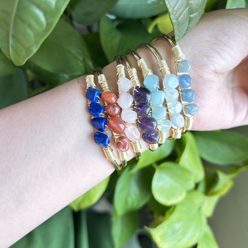 Farbbeständiges Kupferarmband, handgewickelt, mit mehreren Steinen, Steinpulver, Quarz, Amethyst, Aquamarin