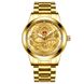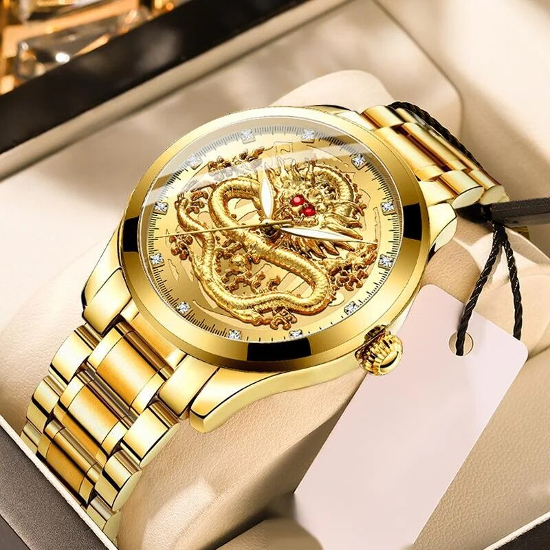 Fenzun geprägte goldene wasserdichte nicht mechanische Herren-Armbanduhr mit rotem Drachengesicht und Diamanteinlage für das mittlere und hohe Alter
