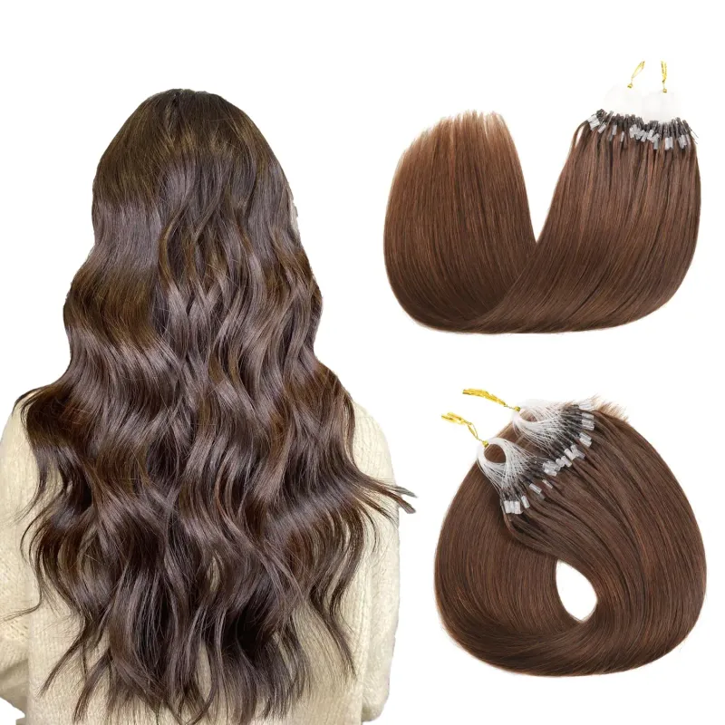 Fish Line Micro Loop Haarverlängerung, Echthaar, glatt, weich und seidig, Micro Ring Loop Haar, mittelbraun, Farbe 4, für Frauen