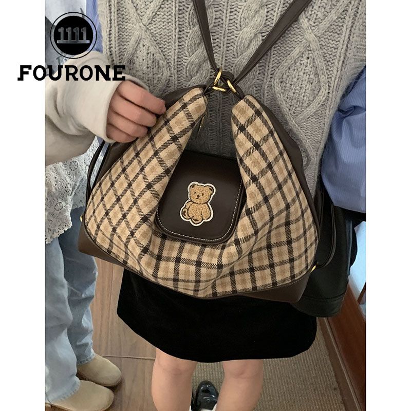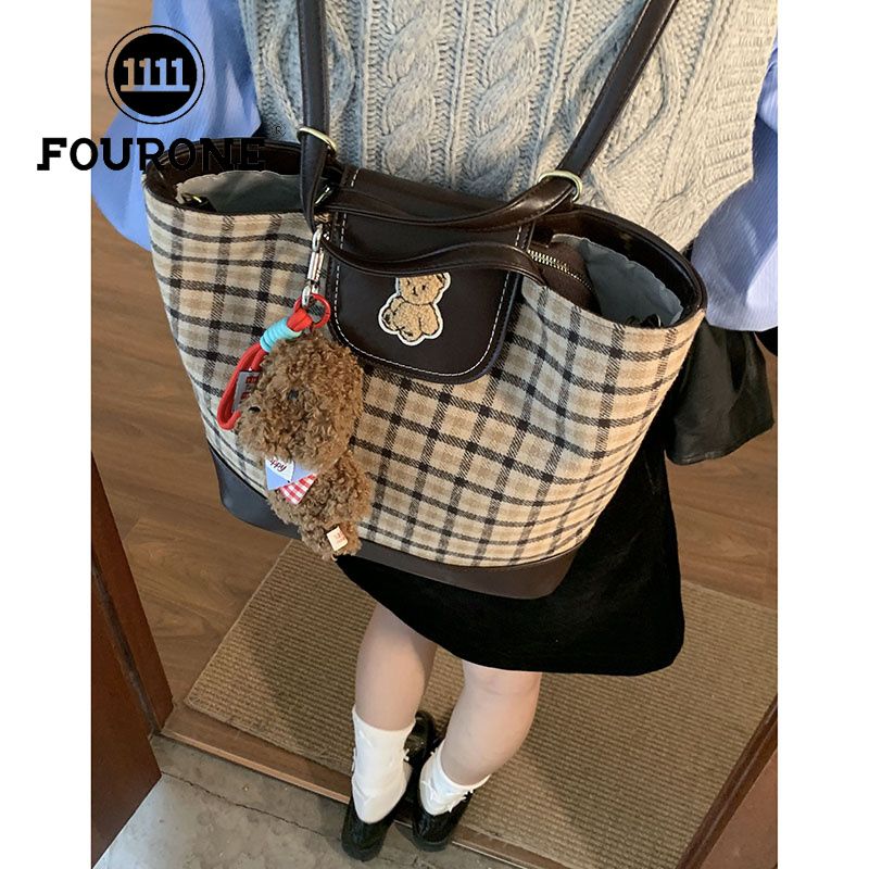 FOUR ONE karierte Teddybärtasche mit mehreren Wassereimertaschen, modisch und vielseitig, Nischendesign, Einzelschulter