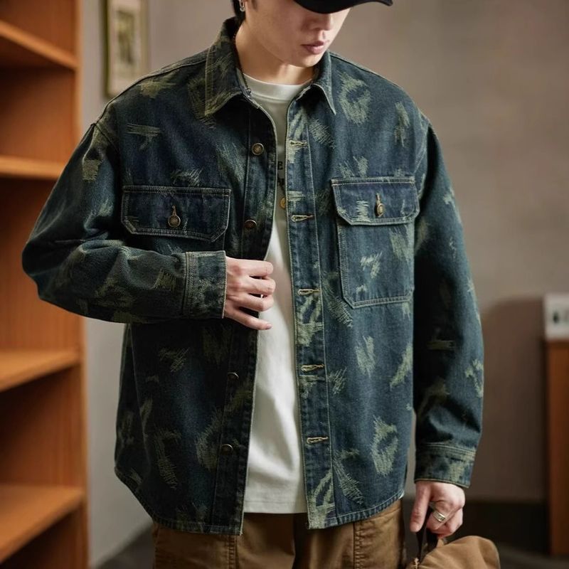Spring and Autumn New Jacquard Long Sleeve Denim Shirt for Men, Trendy Brand, Loose and Handsome, Casual Work Jacket, Outer