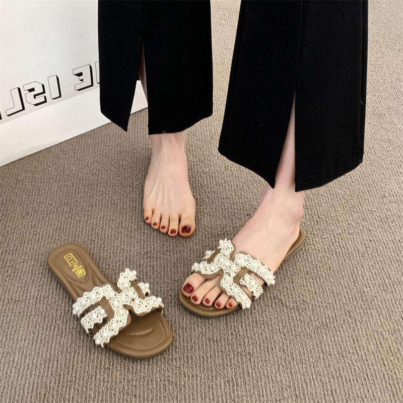 French beaded flat bottomed one-piece slippers for women's summer wear, 2025 new style, small fragrance style with skirt, beach sandals