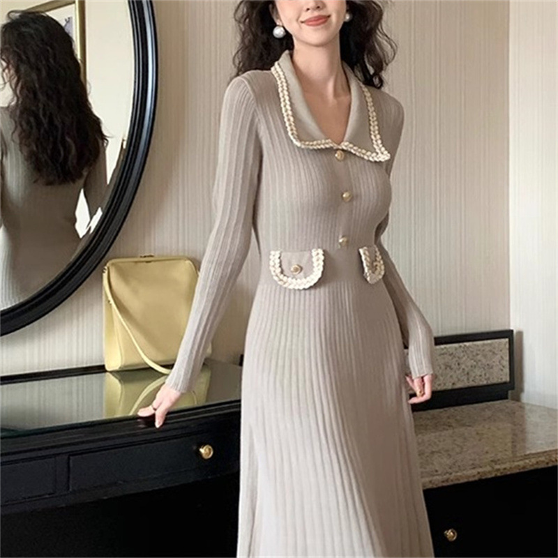 Französischer Stil, kleines, duftendes Revers-Schlankheits-Strickkleid für Damen im Herbst-Design, schlanke Passform, schlanker, hoch taillierter, langer Rock