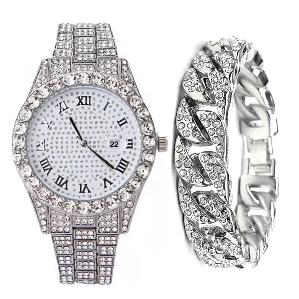 Volle Iced Out Uhr + Armband für Männer Bling Miami Kubanische Kette Armbanduhr Mann Uhr Hip Hop Gold Set frauen Geschenke Uhren