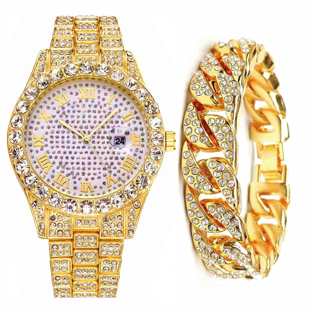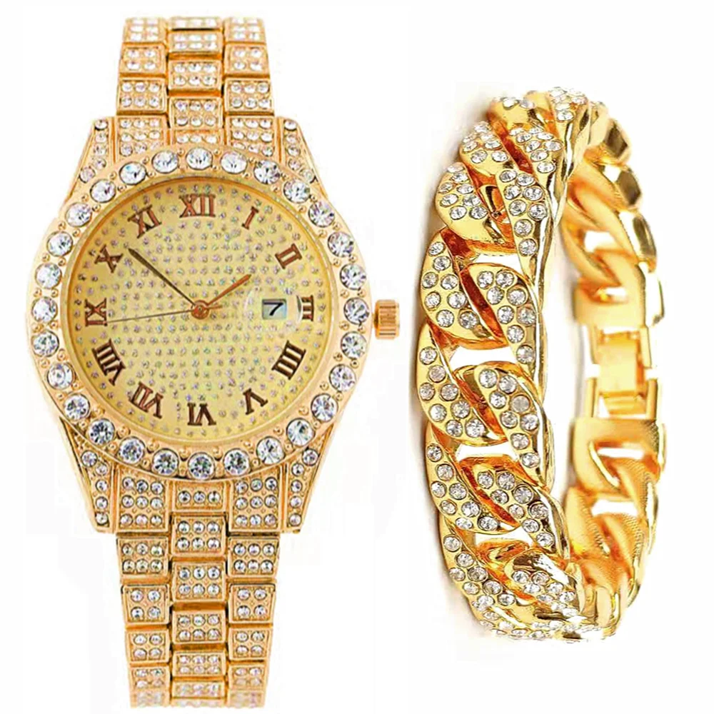 Full Iced Out Watch + Bracelet for Men Bling Miami Cuban Chain Wristwatch Man Clock Hip Hop Gold Set Women Gifts Relojes