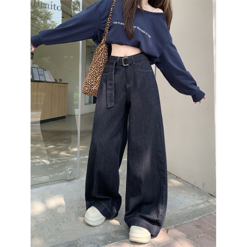 Gürtel in Originalfarbe und Plüschjeans für Damen, neue lockere, gerade, hoch taillierte, lässige Hose mit weitem Bein für Damen